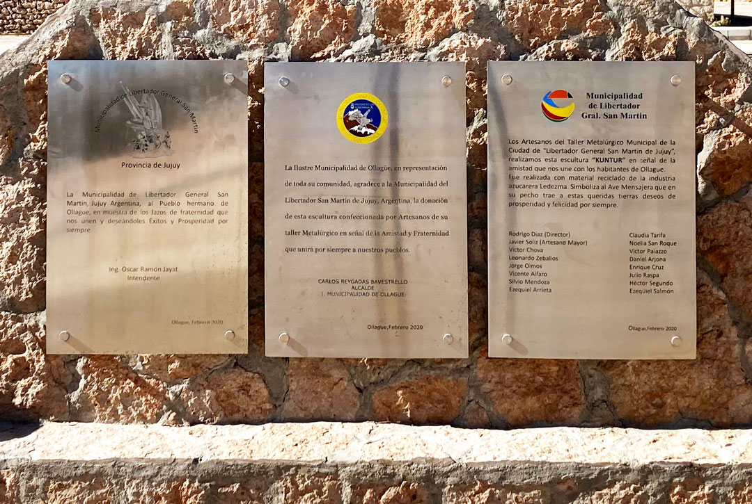 Kuntur, (cóndor en Quechua), Hermosa escultura que podemos apreciar en las calles del poblado de Ollagüe. La obra fue gestionada por la Municipalidad de Ollagüe y la localidad de Jujeña de Libertador General San Martín. La iniciativa es fruto de un convenio de hermandad y trabajo conjunto firmado entre la comuna chilena de Ollagüe y la localidad Argentina, gestionado por el ex-alcalde Carlos Reygadas, Q.E.P.D.